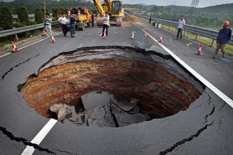 A spokesperson for the local freeway management office said experts on site suspected that the sudden collapse of an underground karst cave created by eroded limestone caused the sinkhole, but the investigation is ongoing.