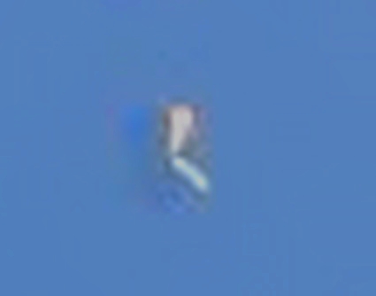MUFON CMS - California - 10/25/2010 - unedited: I stepped out on my back porch to drink my morning coffee of which I always do every day just to take in a bit of the morning sun. I always look up to the sky just to observe the sparrows in the trees and the Honkers of which there are a lot of this time of year. As I scanned the blue sky I noticed a bright white object coming from North and heading south. I immediately thought "how strange this object looked". It was a bright white yet transparent looking object. The front and back were rounded just like a long tube. There was a slight discoloration (slightly darker than the bright white/transparent color of the rest of the object) in the middle which gave it the appearance of a band around it. I listened for "sound" but heard none but I also know that you can't always hear a planes engine until they have passed over you somewhat. I learned this because I see a lot of commercial airliners. I knew immediately this object was different because I couldn't see any wings, tail, windows, or a jet stream. It also seemed to move with more ease like it was gliding. I can't explain why I felt that way except maybe because there was no sound. I remembered my camera was on the table so I ran in the house and grabbed it (coincidently it was sitting on my kitchen table because I had been loading my vacation pics into my laptop that morning!) When I got back out on the porch, less than 10 seconds, I noticed it had moved very fast and my nerves kicked in. I felt I needed to just start snapping photo's or else I was going to lose it. I snapped only 3 frames before it was out of sight. I only caught one good enough to show what I saw and I am pleased. I listened for the "sound" again but heard nothing. It seemed to be heading south but also "up" and it disappeared rather into the high sky before I could blink.