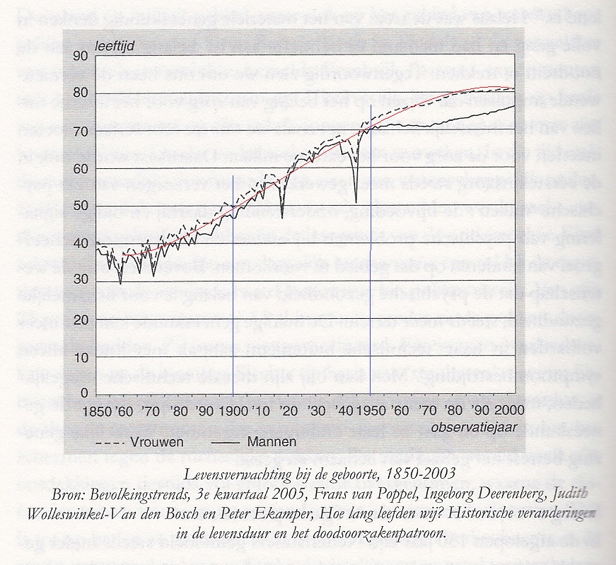 De levensverwachting van de mens is een lijn die stijgt, men wordt steeds ouder. Deze lijn is een van een logaritmische functie, wat inhoudt dat de stijging van de lijn afneemt. De start van deze lijn kende een snelle stijging welke waarneembaar is van 1900 tot 1950, daarna zette de stijging zich verder voort maar in mindere mate. Wat veranderde er dat de stijging zich niet door kon zetten, of was er geen sprake van een verandering die de stijging kon beïnvloeden? Neem hierbij in overweging dat men begonnen is met de DKTP-prik in 1953.