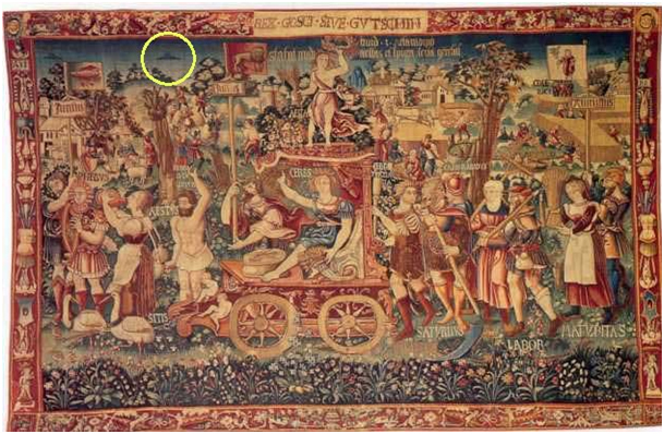Het tapijt dat hieronder staat afgebeeld, is gemaakt in Brugge in 1538. Vandaag de dag hangt het in het nationaal Bavarisch Museum in München. Op het tapijt is een politieke overwinning te zien die uitbundig wordt gevierd, en die van dichtbij wordt gevolgd door niet één, maar meerdere ufo's op de achtergrond. Ik kan er duidelijk twee zien in het linker gedeelte van het tapijt en een ander rechts. Gedetailleerd onderzoek zou misschien meer onthullen.